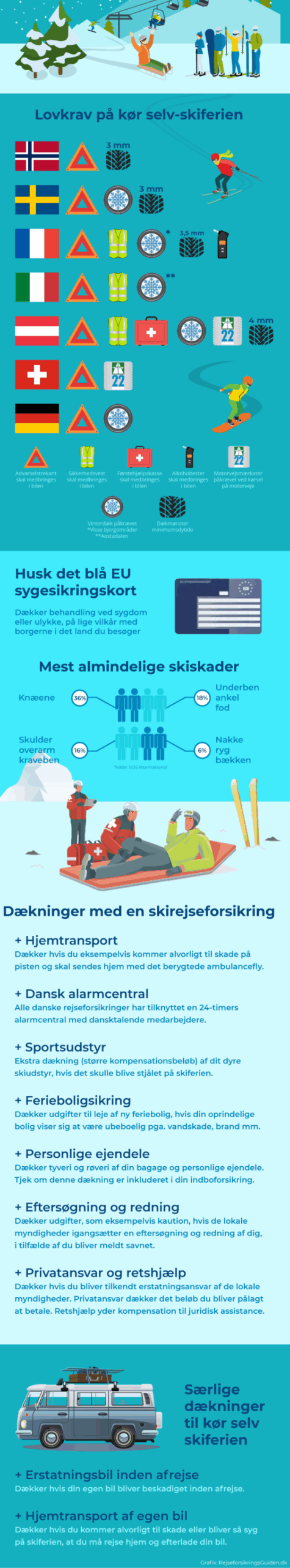 Det blå sygesikringskort dækker behandling, hvis du bliver syg eller kommer til skade i EU, Norge, Island, Liechtenstein eller Schweiz. Du er dækket på lige vilkår med borgerne i det land du rejser til. Det vil sige der er forskel på hvordan du er dækket, alt efter hvor du skal på skiferie. Ydelser der er gratis i Danmark, er ikke nødvendigvis gratis i andre lande.